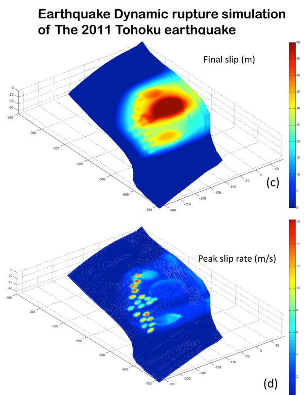 Using the above model we reproduce the main patterns of 2011 Tohoku earthquake, generating tremendous final slip bigger than 50m in the central part of the slab and about 30m in the sallow part close to the trench, see figure(c). This huge slip close to the trench may be one of the key features to the generation of such a big tsunami followed by this earthquake. Finally, our simulations show sharp peak slip velocities at the bottom of the slab, see figure (d), which is in agreement with high frequency energy radiation observed from back-projection studies, Meng et. al. (2011).