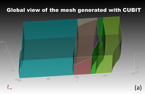 In order to explain such observations we examine the complex rupture process of this event by means of dynamic rupture simulations. We employ the 3D spectral element code SPECFEM3D-SESAME, in which we recently implemented the capability of solving for dynamic fault rupture. Through the usage of a full-featured software toolkit CUBIT for robust unstructured mesh generation, our model can incorporate a non-planar geometry of the megathrust interface. Figure(a) shows the geometry of Japanese subuction zone done with CUBIT and Figure(b) shows a view of the megathurst interface and the bottom surface meshed with linear coarsening in the west-east direction.